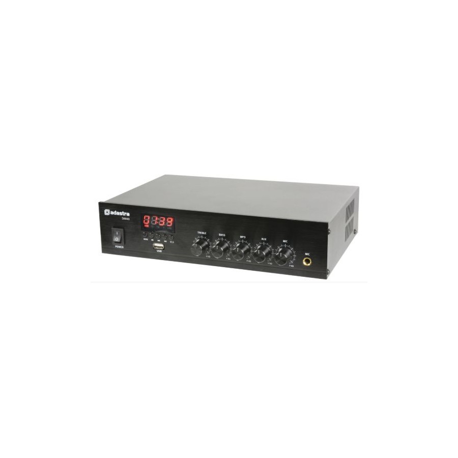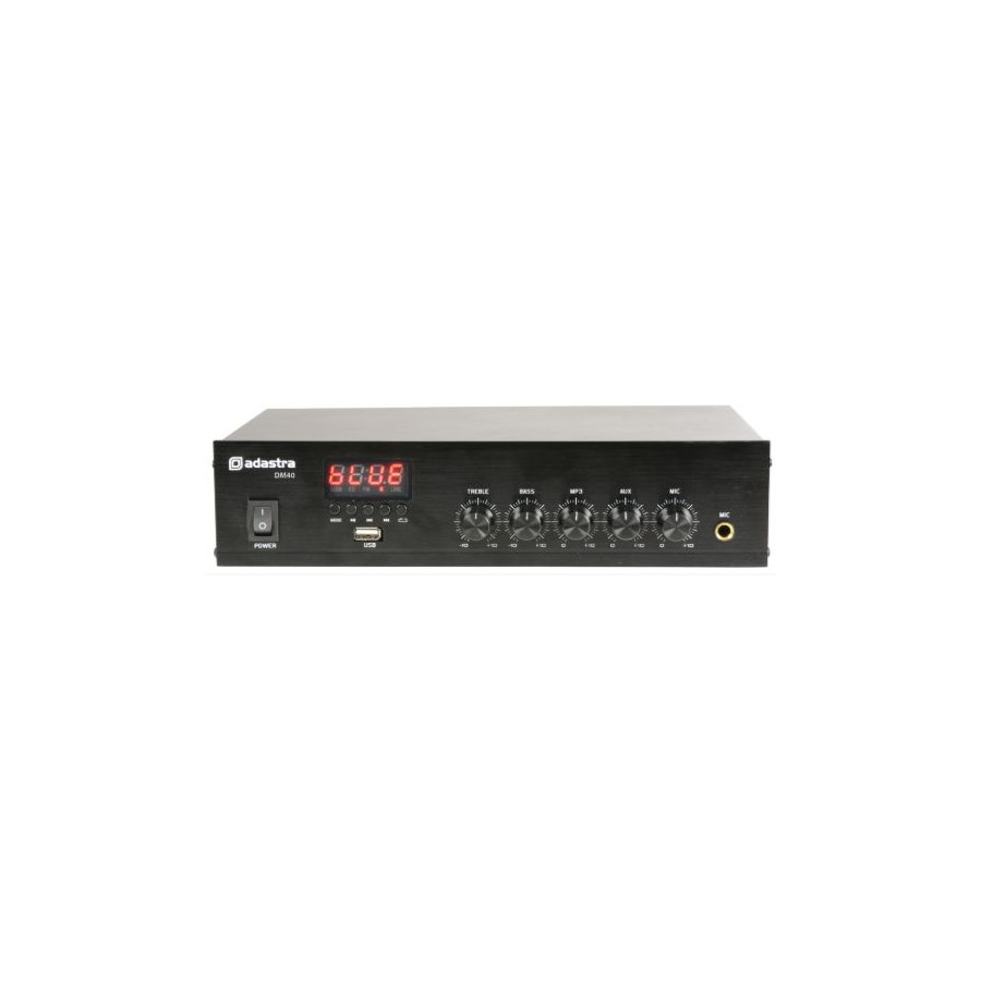 El ADASTRA 953.109UK DM40 es un amplificador de línea de 100V con amplificador digital en una carcasa compacta. El reproductor de audio incorporado acepta medios USB para audio digital o puede sintonizarse con emisoras de radio FM. En el modo Bluetooth, un teléfono inteligente o una tableta pueden emparejarse con el DM25 para la reproducción inalámbrica de audio. Está hecho por Adastra a muy buen precio.