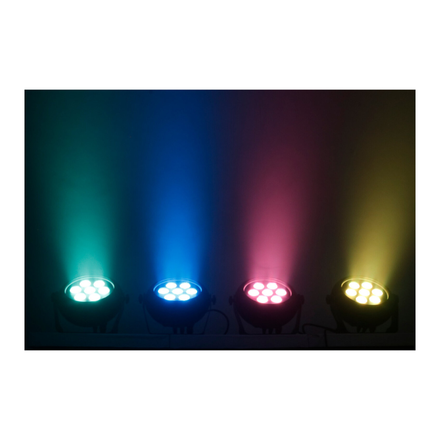 El AFX CLUB-710-IP es un proyector de luces LED resistente al agua con 7 potentes luces de colores. Puede usarse en exteriores y condiciones de humedad.