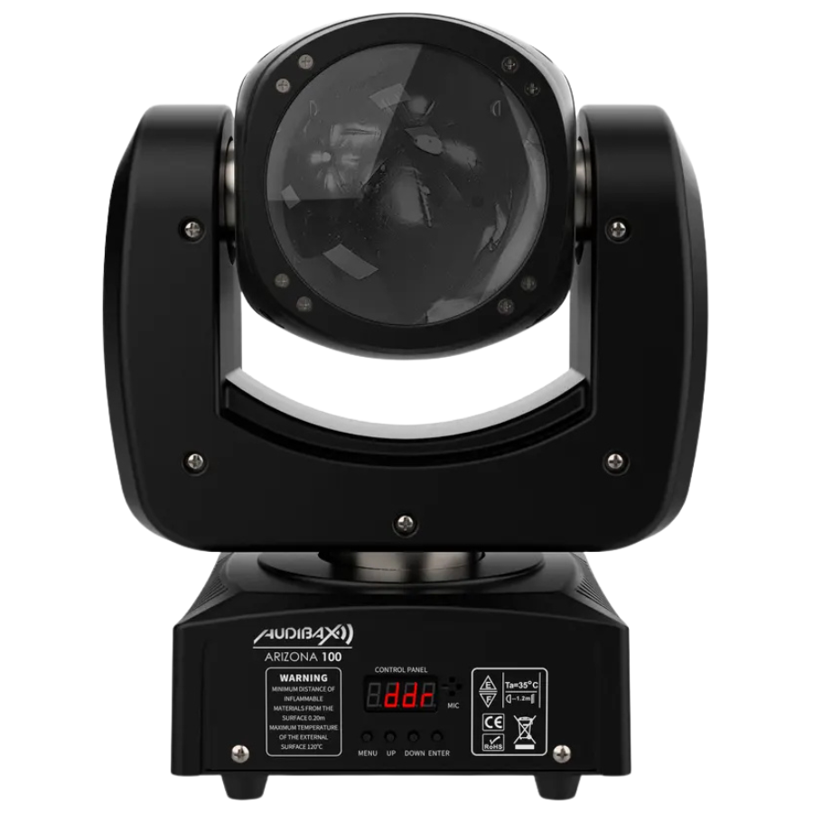 La Audibax Arizona 100 Beam es una cabeza móvil de tipo BEAM equipada con un potente LED de 100W RGBW, capaz de proyectar haces de luz brillantes y definidos, perfectos para crear atmósferas visuales impactantes en salas, clubs, eventos o espectáculos en directo.