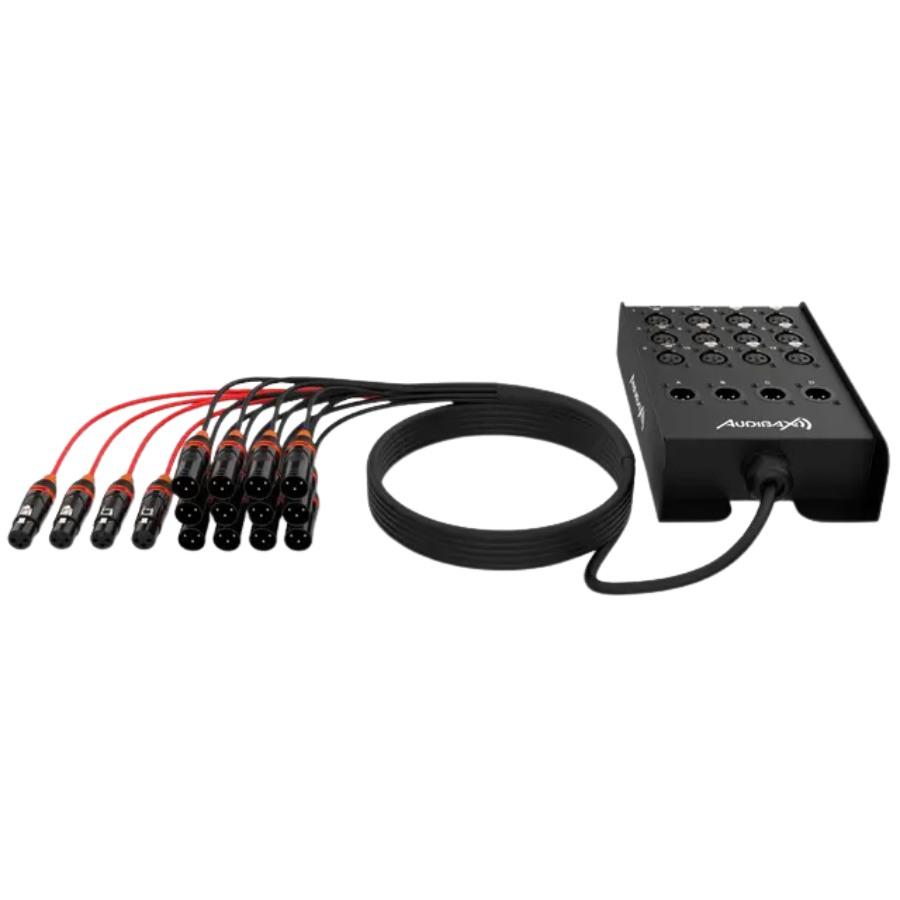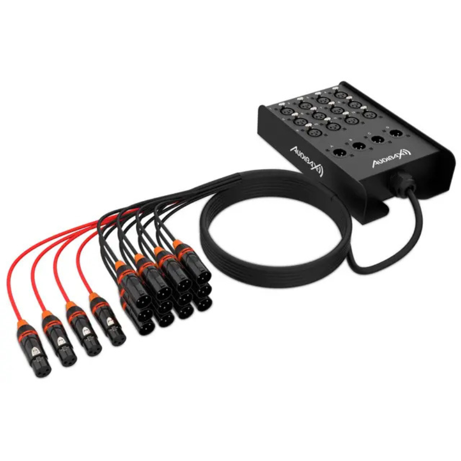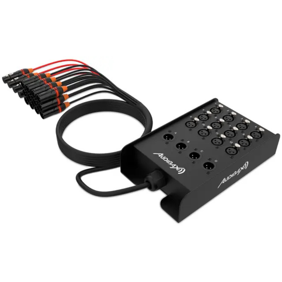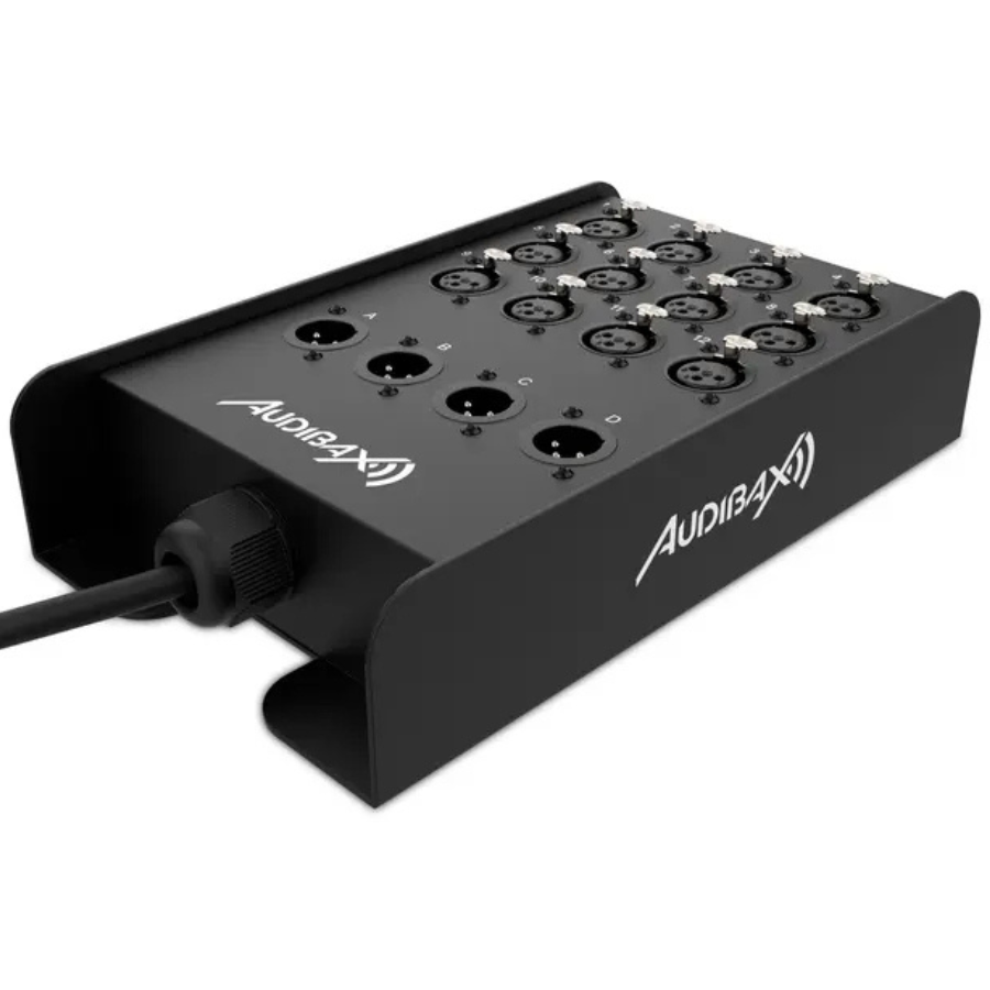 El Audibax Cajetín Escenario 12 Entradas 4 Salidas 15 Metros es una manguera multicore profesional diseñada para simplificar las conexiones de audio en directo. Con 12 entradas XLR hembra y 4 salidas XLR macho, permite una conexión centralizada y ordenada entre el escenario y la mesa de sonido. Su cable de 15 metros y su robusta carcasa metálica aseguran durabilidad, alcance y una señal limpia, ideal para conciertos, eventos en vivo, estudios móviles o instalaciones fijas.