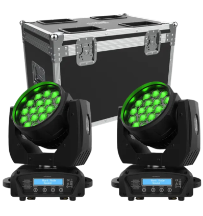 El kit incluye un flight case doble a medida, pensado para alojar ambas cabezas móviles y facilitar su traslado de forma segura y ordenada. Las dimensiones del case son aproximadamente 690 mm × 560 mm × 430 mm, lo que lo convierte en una solución rentable para DJs que se desplazan con frecuencia o empresas de alquiler.