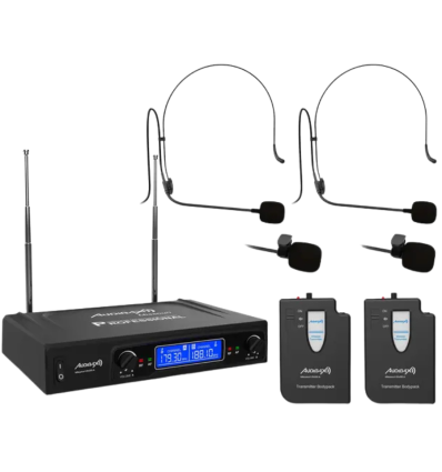 El Audibax Missouri 2500 es un sistema de micrófonos inalámbricos VHF con doble canal, ideal para quienes necesitan libertad de movimiento sin sacrificar calidad de audio. Equipado con dos petacas transmisoras y cuatro micrófonos (dos lavalier y dos de diadema), se adapta a cualquier situación: presentaciones, clases, actuaciones, eventos y más. El receptor incorpora antenas diversity que mejoran la estabilidad de la señal y minimizan cortes. Además, ofrece una cobertura de hasta 80 metros, lo que lo convierte en una solución efectiva tanto en interiores como exteriores.