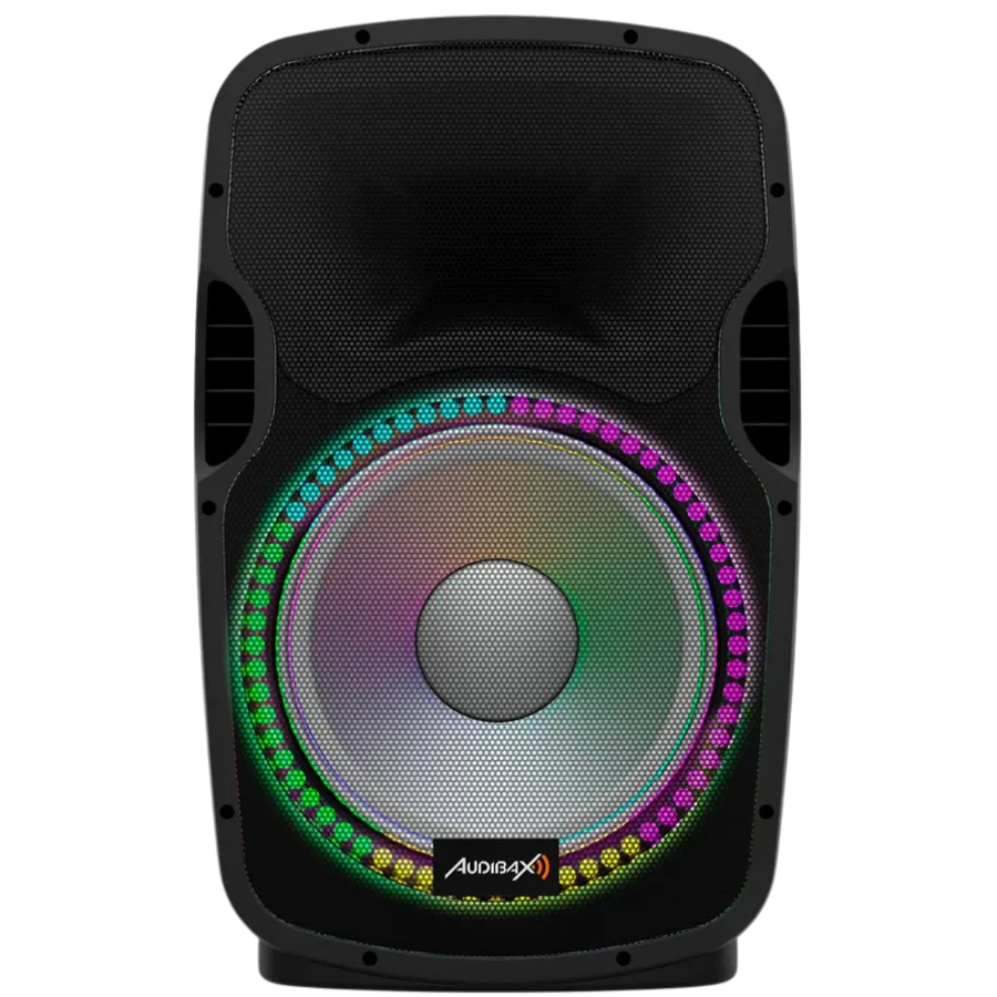 El Audibax Party 15 es un altavoz activo profesional de 15 pulgadas y 250 W RMS (hasta 600 W pico), diseñado para DJs, eventos y animaciones. Incorpora reproductor USB/SD, Bluetooth, radio FM, entradas para micrófono y línea, además de un efecto LED RGB integrado. Su sistema de 2 vías garantiza sonido claro y potente, ideal para usar directamente sin mezcladores ni amplificadores externos.