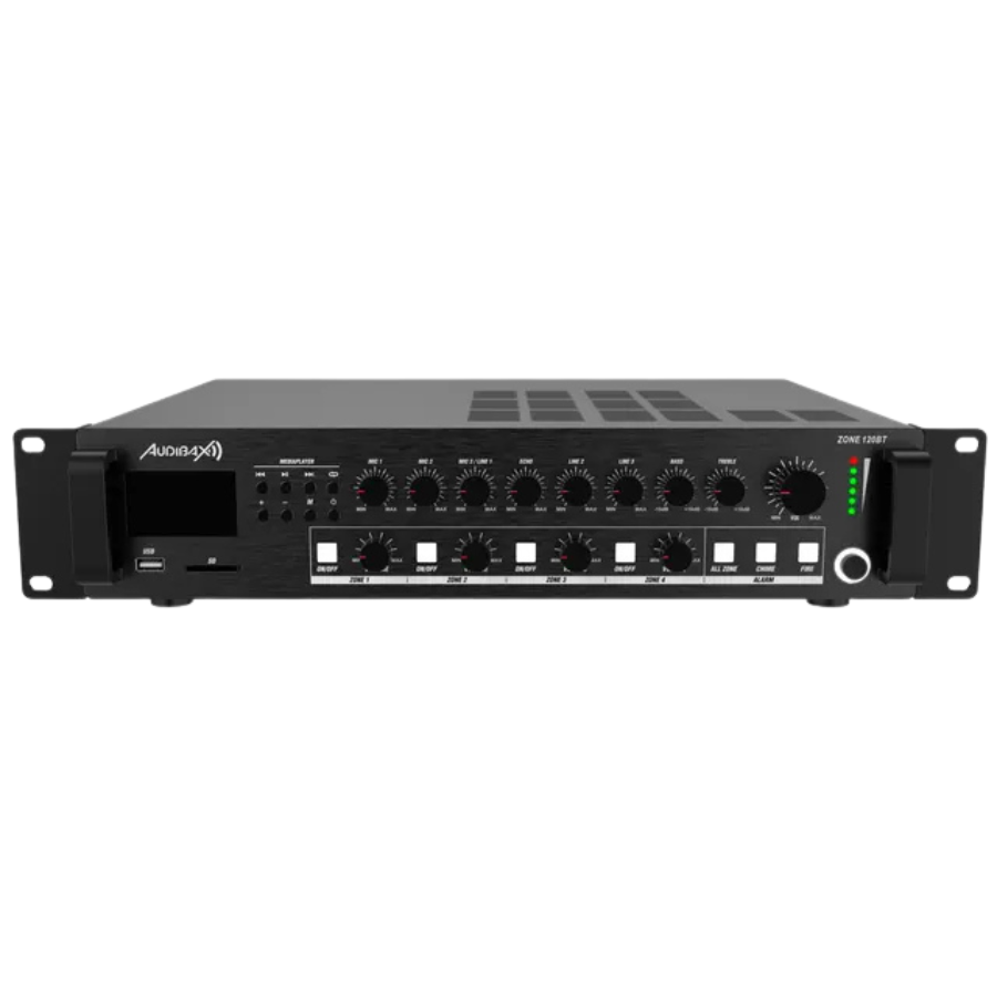 El Audibax Zone 120BT es un amplificador versátil, diseñado para sistemas de sonido donde se requiere distribuir audio a diferentes zonas de forma controlada y eficiente. Gracias a sus 4 salidas independientes a 100 V y una salida adicional a baja impedancia, es ideal para espacios como restaurantes, tiendas, centros comerciales, hoteles o gimnasios.