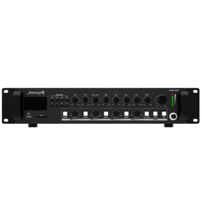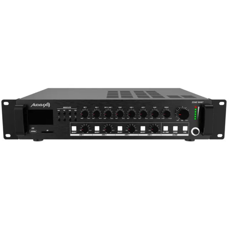 El Audibax Zone 360BT es un amplificador mezclador profesional de 4 zonas con una potencia total de 360 W RMS, ideal para instalaciones de sonido ambiental. Incorpora salidas de alta y baja impedancia, entradas de micrófono con phantom, reproductor USB/SD, radio FM y Bluetooth para reproducción inalámbrica. Es perfecto para tiendas, bares, oficinas o gimnasios que buscan calidad de sonido, versatilidad y control independiente por zonas.