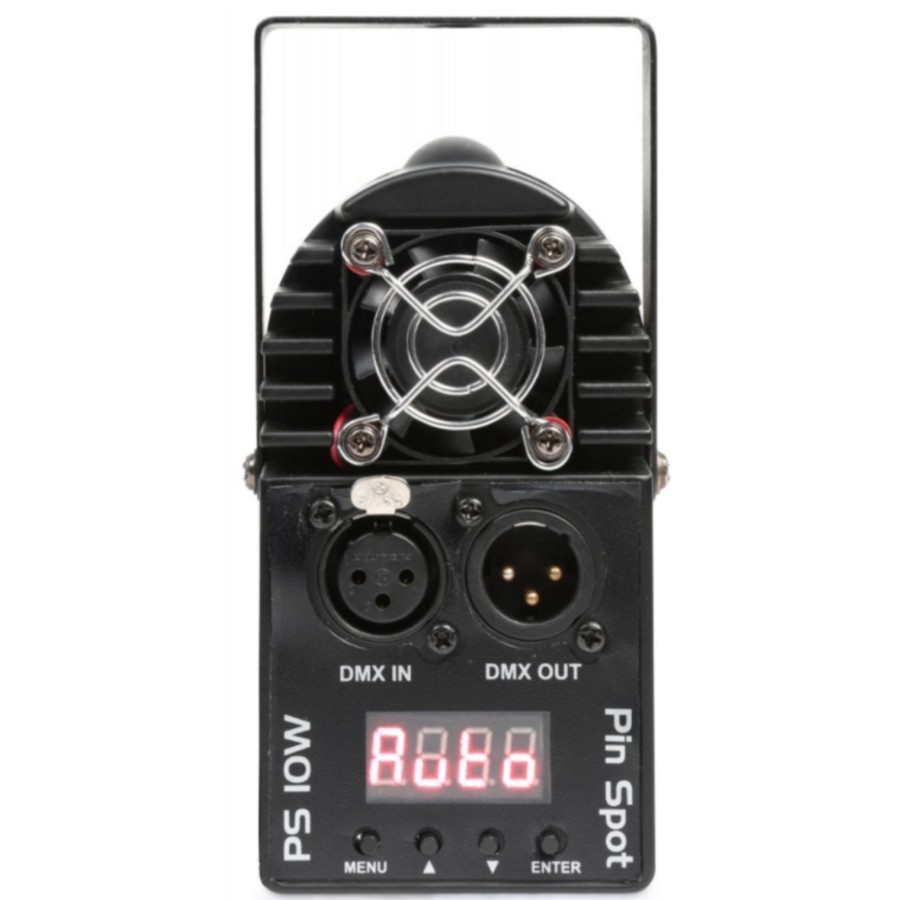 El foco Pin PS10W utiliza un LED brillante de 10 watios 4-en-1. El LED incorpora los colores rojo, verde, azul y blanco. Al ser de rayo estrecho es ideal para iluminar bolas de espejo, consiguiendo ese efecto de maravillas cuando se reproduce en los millones de reflejos de los espejos. El foco puede controlarse por DMX o autonomo en formato ritmo de la musica o auto. Podemos fijar el color del foco o cambiar secuencialmente el mismo. Al encender de nuevo el foco se recordara la ultima orden dada.