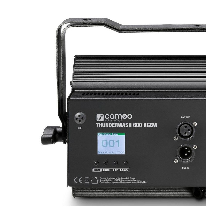 La navegación por el menú y la configuración son muy sencillas gracias a la pantalla de cristal líquido a color de gran contraste con cuatro botones. El Thunder Wash 600 RGBW posee una robusta carcasa metálica con un soporte de montaje universal. Los conectores de 3 pines compatibles con DMX y powerCON permiten conectar en cadena varios equipos cómodamente. Esto le permite aumentar aún más el atractivo de su espectáculo con varios focos.