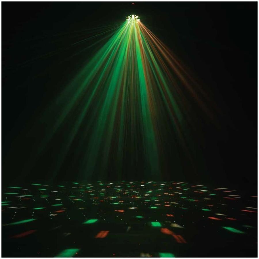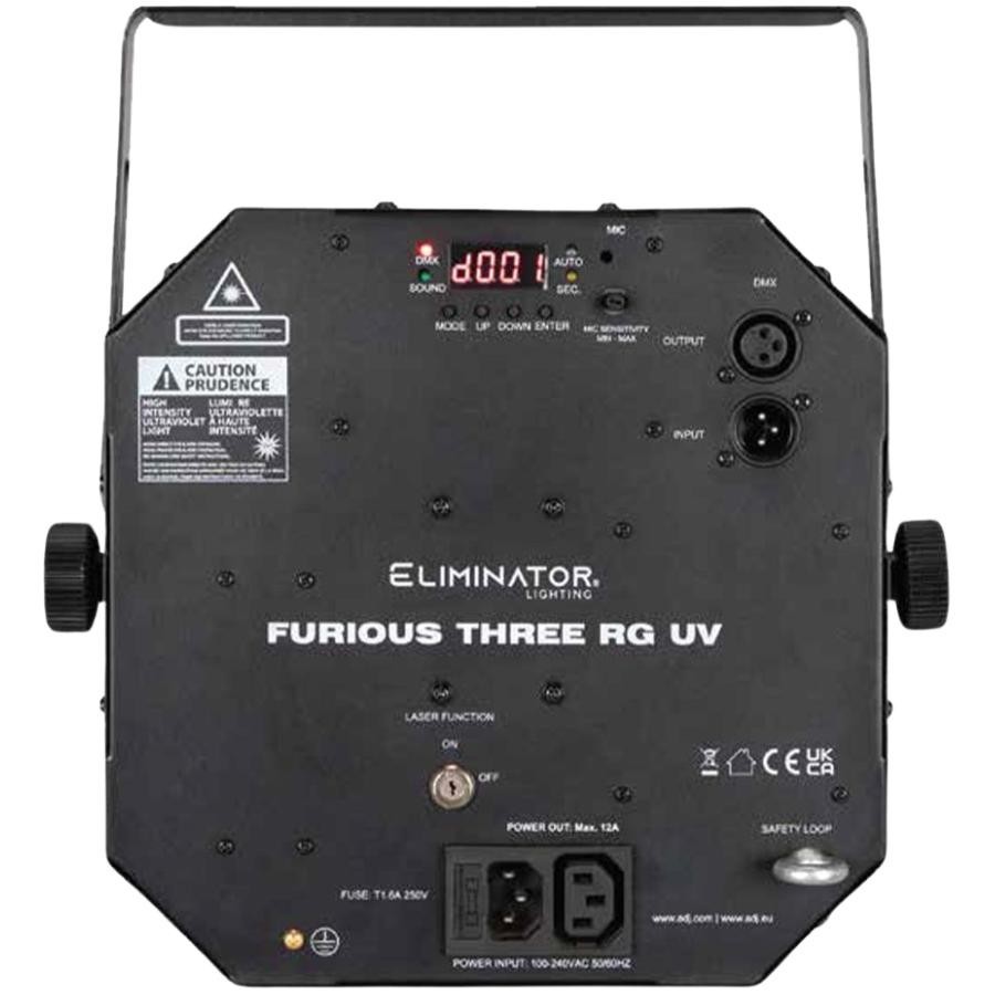 El ELIMINATOR FURIOUS THREE RG es un emocionante efecto de iluminación para fiestas que combina tres fuentes de luz en un solo dispositivo: seis LEDs penta de 5W, ocho LEDs quad de 3W y un láser rojo y verde.