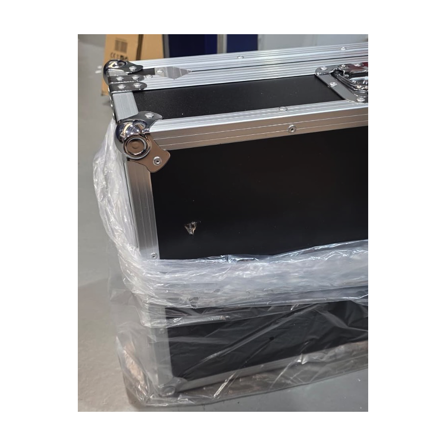 Este flightcase está construido con materiales reforzados y cuenta con esquinas metálicas de protección, lo que lo hace altamente resistente a golpes y caídas, ideal para DJs que transportan su equipo con frecuencia.