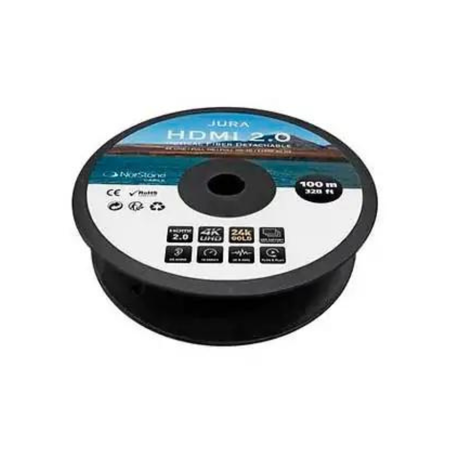 Sumérgete en el mundo de la alta definición con el cable NORSTONE CABLE JURA HDMI-ÓPTICO 100 MTS. Desarrollado para cumplir con los estándares HDMI 2.0, este cable de fibra óptica desmontable ofrece compatibilidad con transmisiones UHD/4K 60Hz HDR, Full HD, 3D y audio 7.1 en alta definición.