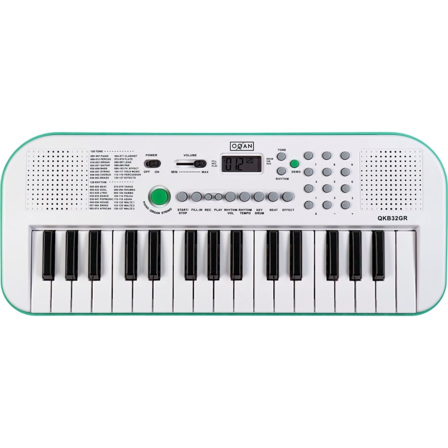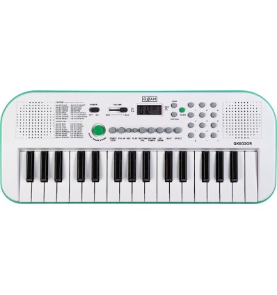El OQAN QKB32GR verde es un teclado portátil de iniciación, ideal para niños o principiantes, que incorpora 32 teclas mini, 128 sonidos, 128 ritmos y 30 canciones de demostración, junto con funciones como vibrato, sustain, modo percusión, grabación‑reproducción, salida de auriculares y alimentación por USB o pilas. Su acabado en color verde le da un estilo divertido para el entorno doméstico. Con dimensiones compactas (470 × 200 × 51 mm) y un peso ligero aproximado de 1 kg, es perfecto para aprender música de forma accesible y con estilo.
