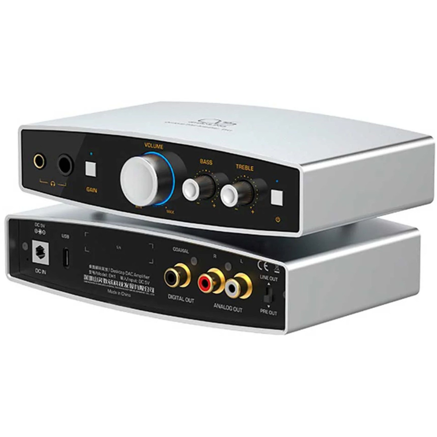 El Shanling EH1 plata es un DAC y amplificador de auriculares de escritorio, compacto y de alto rendimiento. Equipado con el chip Cirrus Logic CS43198, ofrece soporte para audio Hi‑Res hasta 32bit/768kHz y DSD512. Dispone de salidas 6.35 mm y 4.4 mm balanceada, control de graves y agudos, y salidas RCA y coaxial. Funciona como DAC USB mediante USB‑C o con fuente de alimentación externa. Ideal para mejorar la experiencia sonora con auriculares exigentes o sistemas de audio de escritorio.