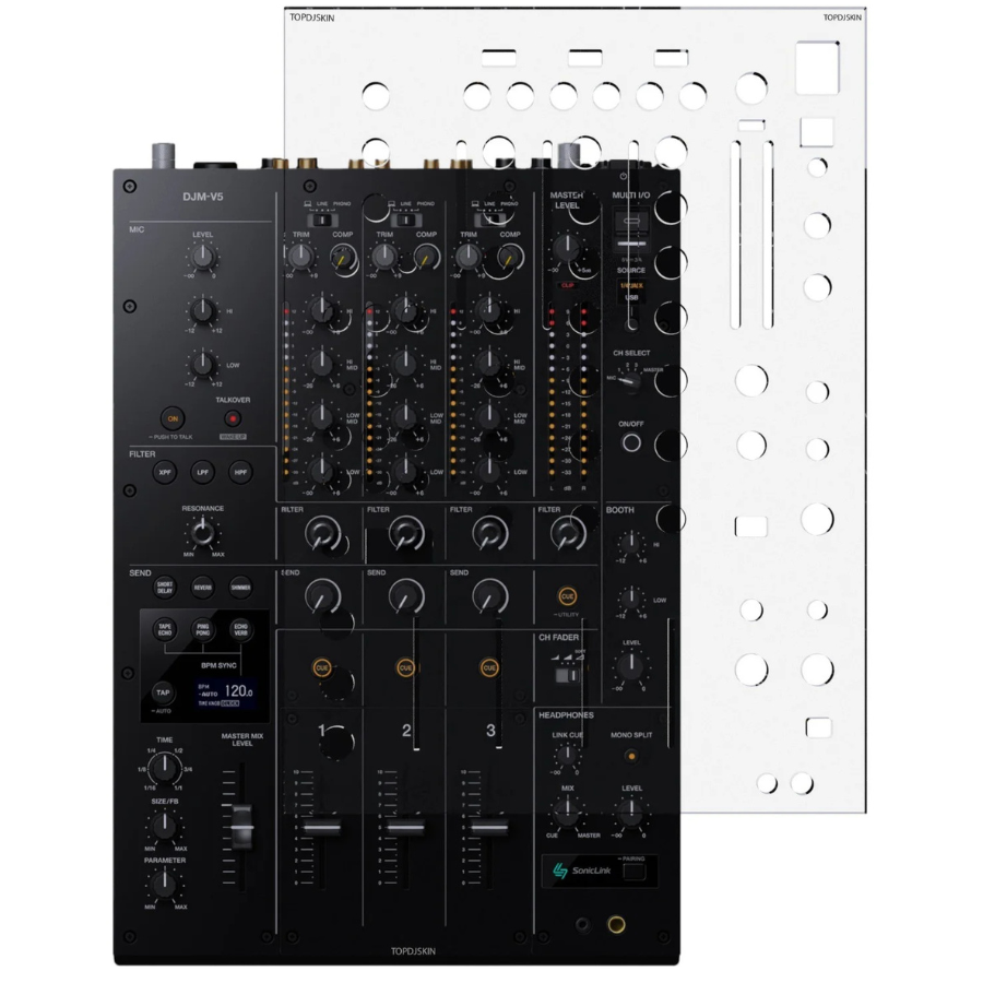 El TOPDJ SKIN ALPHATHETA DJM-V5 es un accesorio de protección profesional creado específicamente para preservar la superficie de la mesa de mezclas AlphaTheta DJM-V5 frente al uso intensivo, el transporte frecuente y el paso del tiempo. Su diseño a medida garantiza un encaje perfecto, respetando la disposición de botones, faders y potenciómetros.