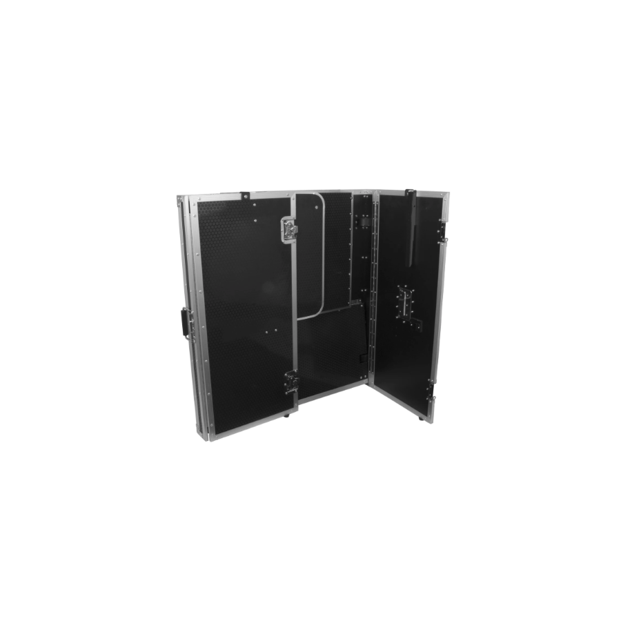 Es un maletín / mesa que está construido con madera contrachapada maciza de 9 mm de espesor, un patrón de "agarre de escenario" de panal de abeja/hexagonal. Cuenta con ruedas de rodillo de borde en un lado para un transporte conveniente y asas de resorte de alta resistencia para una elevación y carga segura.